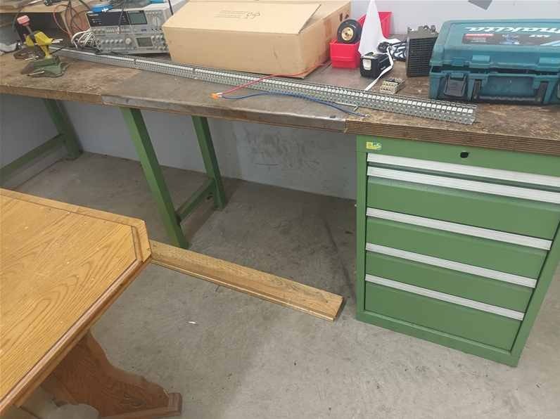| Beschreibung | Werkbank 2-tlg. + Teleskopschubladenschrank, 5 Schübe |